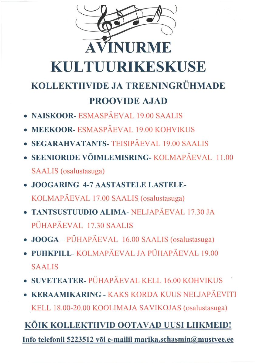Avinurme Kultuurikeskuse kollektiivide ja treeningrühmade proovide ajad