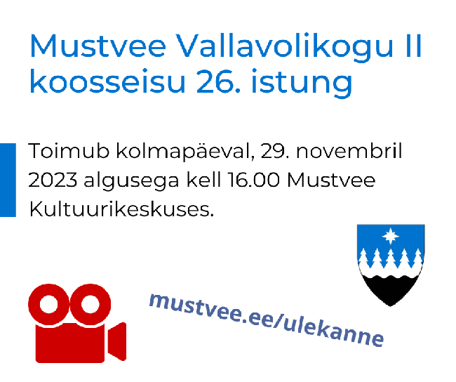 Mustvee Vallavolikogu II koosseisu 26. istung toimub kolmapäeval, 29. novembril 2023 algusega kell 16.00 Mustvee Kultuurikeskuses.